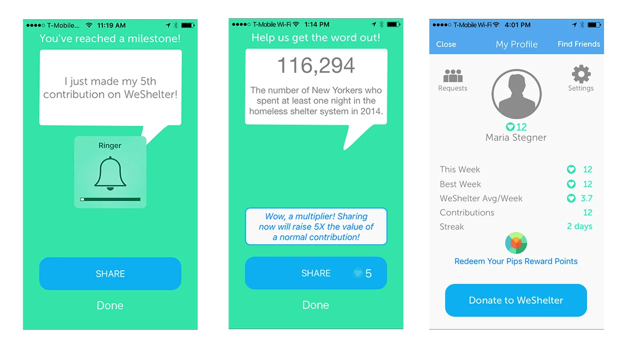 3. The app then moves through a couple more screens with speech bubble messages with some stats about the number of homeless people in the New York area in the year 2014, and another call to action to share this activity somehow.